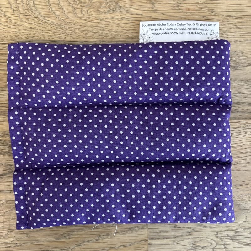 Bouillotte sèche Petit Modèle « Le P’tit Bébo » – Tissu PETITS POIS BLANCS Fond violet